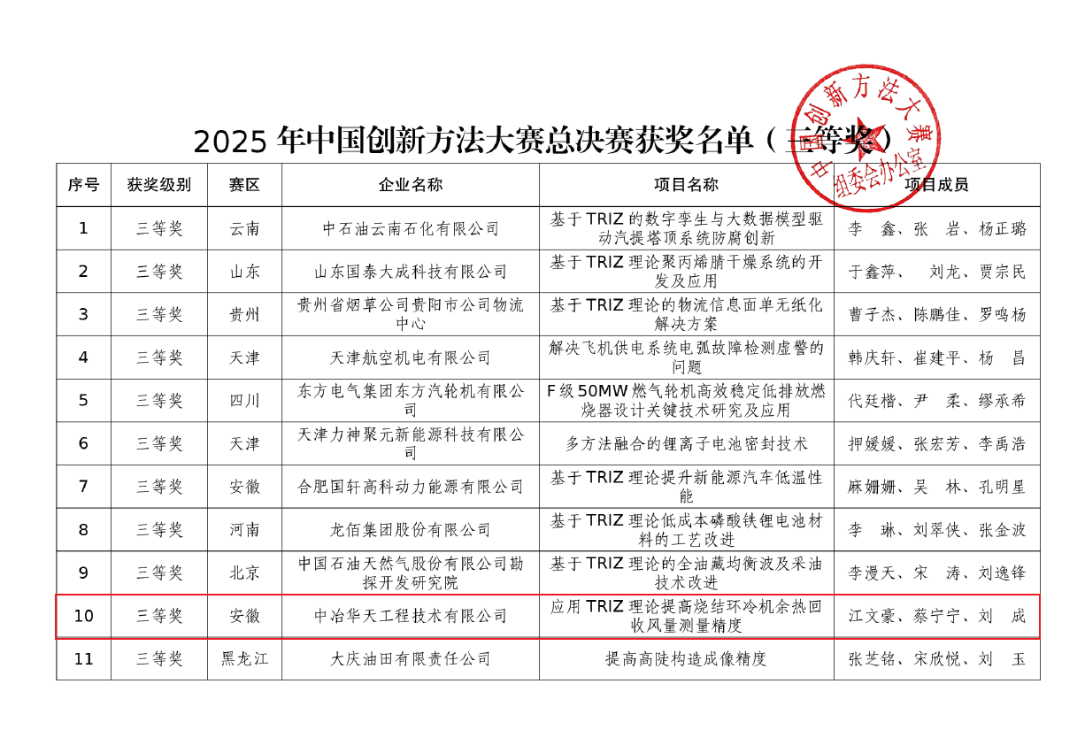 11月17日至21日,2025年中國創(chuàng )新方法大賽全國總決賽在山東泰安和濟南舉辦,中冶華天參賽作品《應用TRIZ理論提高燒結環(huán)冷機余熱回收風(fēng)量測量精度》斬獲三等獎,充分展現了華天積淀深厚的創(chuàng )新底蘊和華天員工昂揚奮進(jìn)的創(chuàng )新風(fēng)采。