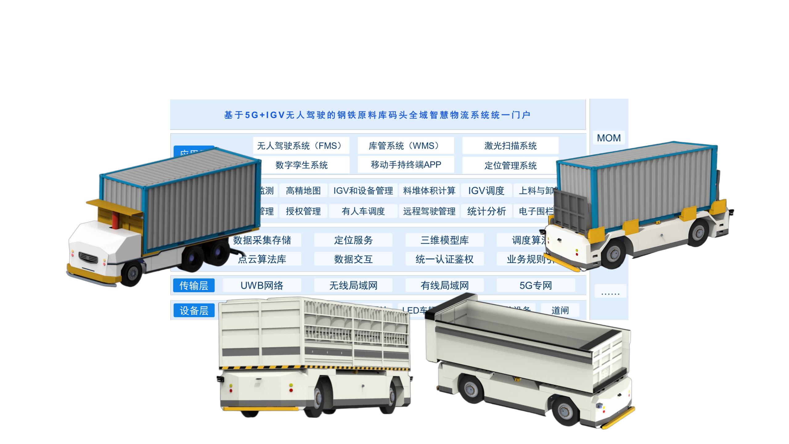 構建協(xié)同體系,彰顯集成領(lǐng)導力。為響應業(yè)主戰略需求,中冶華天充分發(fā)揮在工業(yè)智能與系統集成領(lǐng)域的專(zhuān)業(yè)優(yōu)勢,為其量身定制了“基于5G+IGV無(wú)人駕駛的鋼鐵原料庫碼頭全域智慧物流系統”整體解決方案,以技術(shù)革新實(shí)現從“人車(chē)混流”到“全域無(wú)人”、從“經(jīng)驗調度”到“智能決策”的根本性轉變。具體亮點(diǎn)更是層出不窮:項目團隊構建了“智能裝備+智慧路側+云控平臺”的一體化技術(shù)架構,其自主研發(fā)的、集智能調度(TMS)、倉儲管理(WMS)與數字孿生監控于一體的綜合管控平臺成為系統“智慧大腦”,實(shí)現了多車(chē)動(dòng)態(tài)調度、庫存實(shí)時(shí)精準管理與全流程可視化管控;面對要與東方特鋼ERP、MOM、無(wú)人計量等多個(gè)系統深度融合的復雜挑戰,項目團隊主導制定了統一的數據標準與接口規范,成功打通信息壁壘,實(shí)現了跨系統的高效協(xié)同;通過(guò)統籌協(xié)調生態(tài)伙伴,項目團隊攜手山東蓬翔汽車(chē)(提供IGV車(chē)輛平臺)、斯乾智駕(提供無(wú)人駕駛系統)等,在統一架構下實(shí)現技術(shù)深度融合,確保了系統整體的穩定、安全與高效。