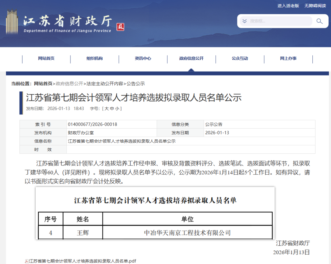 1月13日,江蘇省財(cái)政廳公布“江蘇省會(huì)計(jì)領(lǐng)軍人才”(第七期)擬錄取人員名單。經(jīng)過(guò)申報(bào)、資格審核、背景評(píng)分、筆試與面試等多輪嚴(yán)格選拔,中冶華天財(cái)務(wù)管理部王輝從全省央國(guó)企、上市公司、三甲醫(yī)院、高等院校、獨(dú)角獸企業(yè)等各類重點(diǎn)單位的優(yōu)秀財(cái)務(wù)負(fù)責(zé)人及總會(huì)計(jì)師群體中脫穎而出,成功入選,再次彰顯了華天財(cái)務(wù)人員的專業(yè)實(shí)力與業(yè)務(wù)素養(yǎng)。